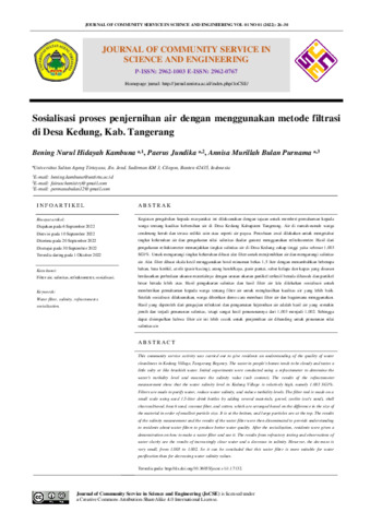 Bening, Nurul Hidayah Kambuna and Paerus, Jundika and Annisa, Murillah Bulan Purnama (2022) Sosialisasi proses penjernihan air dengan menggunakan metode filtrasi di Desa Kedung, Kab. Tangerang. Journal of Community Service in Science and Engineering, 1 (1): 7. pp. 26-30. ISSN 2962-1003