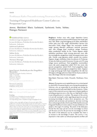 Khalidatul, Khair Anwar and Syahrianti, Syahrianti and Sultina, Sarita and Nurnasari, Patongai (2021) Pembinaan Kader Posyandu tentang perawatan masa nifas. Jurnal Inovasi, Pemberdayaan dan Pengabdian Masyarakat, 1 (1): 1. pp. 1-5. ISSN 2963-4458