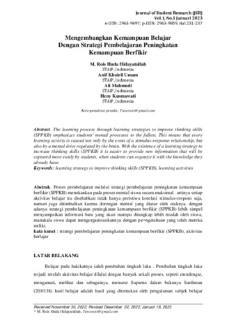 M., Rois Huda Hidayatullah and Anif, Khoiril Umam and Ali, Mahmudi and Heny, Kusmawati (2023) Mengembangkan kemampuan belajar dengan strategi pembelajaran peningkatan kemampuan berfikir. Journal of Student Research (JSR), 1 (1): 17. pp. 231-237. ISSN 2963-9859