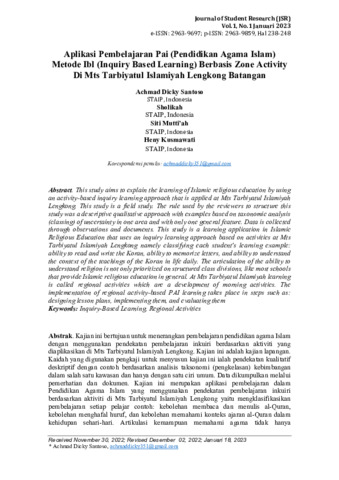 Achmad, Dicky Santoso and Sholikah, Sholikah and Heny, Kusmawati (2023) Aplikasi pembelajaran PAI (Pendidikan Agama Islam) Metode IBL (Inquiry Based Learning) berbasis zone activity di MTs Tarbiyatul Islamiyah Lengkong Batangan. Journal of Student Research (JSR), 1 (1): 18. pp. 238-248. ISSN 2963-9859