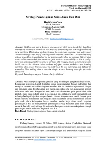 Hanik, Mutma'inah and Muhammad, Ainun Najib and Heny, Kusmawati (2023) Strategi pembelajaran sains anak usia dini. Journal of Student Research (JSR), 1 (1): 19. pp. 249-264. ISSN 2963-9859