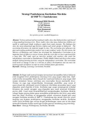 Muhammad, Rifki Mustofa and Lu’luil, Maknun and Heny, Kusmawati (2023) Strategi pembelajaran kurikulum merdeka di SMPN 1 Tambakromo. Journal of Student Research (JSR), 1 (1): 20. pp. 265-270. ISSN 2963-9859