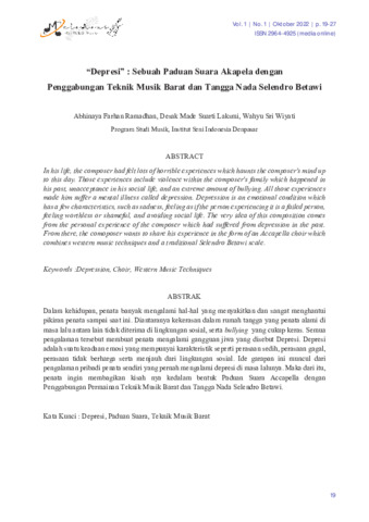 Abhinaya, Farhan Ramadhan and Desak, Made Suarti Laksmi and Wahyu, Sri Wiyati (2022) “Depresi” : sebuah paduan suara akapela dengan penggabungan teknik musik barat dan tangga nada selendro betawi. Melodious: Journal of Music, 1 (1): 3. pp. 19-27. ISSN 2964-4925