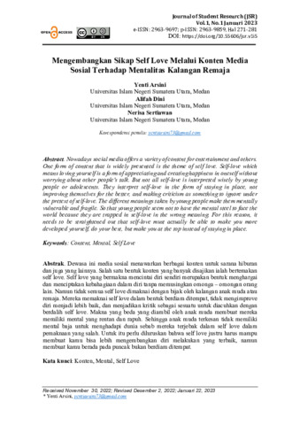 Yenti, Arsini and Alifah, Dini and Nerisa, Sertiawan (2023) Mengembangkan sikap self love melalui konten media sosial terhadap mentalitas kalangan remaja. Journal of Student Research (JSR), 1 (1): 21. pp. 271-281. ISSN 2963-9859
