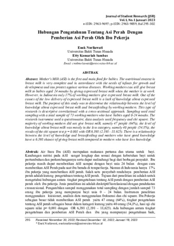 Enok, Nurliawati and Etty, Komariah Sambas (2023) Hubungan pengetahuan tentang asi perah dengan pemberian asi perah oleh ibu pekerja. Journal of Student Research (JSR), 1 (1): 23. pp. 295-302. ISSN 2963-9859