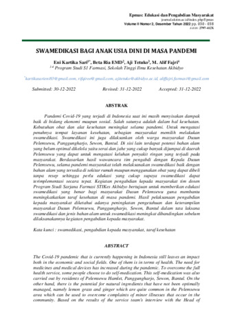 Eni, Kartika Sari and Beta, Ria EMD and Aji, Tetuko and M. Alif, Fajri (2022) Swamedikasi bagi anak usia dini di masa pandemi. Epmas: Edukasi dan PengabdianMasyarakat, 2 (2): 5. pp. 30-38. ISSN 2797-412X