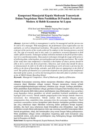 Rawiya, Rawiya and Pitriani, Nasution (2023) Kompetensi manajerial kepala madrasah tsanawiyah dalam pengelolaan mutu pendidikan di Pondok Pesantren Modern Al Habib Kecamatan Sei Lepan. Journal of Student Research (JSR), 1 (1): 32. 404 -413. ISSN 2963-9859
