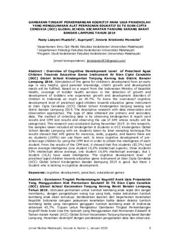 Festy Ladyani, Mustofa and Supriyati, Supriyati and Jimbris Kristianto, Mombilia (2020) Gambaran tingkat perkembangan kognitif anak usia prasekolah yang menggunakan alat permainan edukatif di TK Dian Cipta Cendikia (DCC) global school kecamatan Tanjung Karang Barat Bandar Lampung tahun 2019. Jurnal Medika Malahayati, 4 (1): 2. 9 -15. ISSN 2355-6757