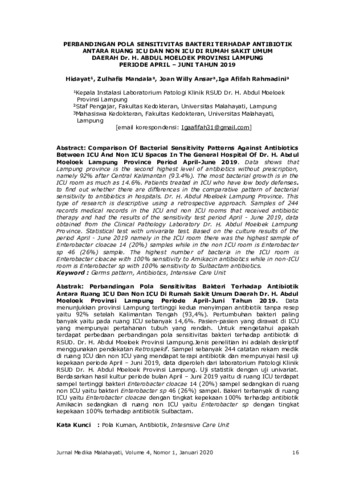 Hidayat, Hidayat and Zulhafis, Mandala and Joan Willy, Ansar and Iga Afifah, Rahmadini (2020) Perbandingan pola sensitivitas bakteri terhadap antibiotik antara ruang ICU dan non ICU di rumah sakit umum daerah dr. H. Abdul Moeloek provinsi Lampung periode april – juni tahun 2019. Jurnal Medika Malahayati, 4 (1): 3. 16 -24. ISSN 2355-6757