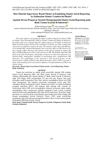 Rifdah, Safinatun Najah and Dita, Andraeny (2023) Does shariah supervisory board matter in explaining islamic social reporting by Indonesian Islamic Commercial Banks? Jurnal Ekonomi Syariah Teori dan Terapan, 10 (3): 3. pp. 235-248. ISSN 2407-1935