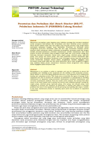 Emil, Salim and Muh. Alfito, Ramadhan and Sudarsono, Sudarsono and Aminur, Aminur (2022) Perawatan dan perbaikan alat Reach Stacker (RS) PT. Pelabuhan Indonesia IV (PERSERO) Cabang Kendari. PISTON: Jurnal Teknologi, 6 (1): 2. pp. 11-20. ISSN 2502-7018