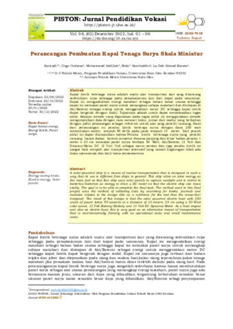 Suriyadi, Suriyadi and Ungo, Ibuhasa and Muhammad, Abdillah and Rizki, Rizki and Samhuddin, Samhuddin and La Ode Ahmad, Barata (2022) Perancangan pembuatan kapal tenaga surya skala miniatur. PISTON: Jurnal Teknologi, 6 (2): 1. pp. 1-6. ISSN 2502-7018