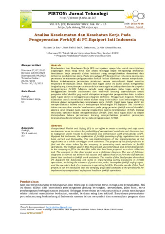 Harjum La, Bau and Muh Fadhil, Safli and Sudarsono, Sudarsono and La Ode Ahmad, Barata (2022) Analisa keselamatan dan kesehatan kerja pada pengoperasian forklift di PT. Equiport Inti Indonesia. PISTON: Jurnal Teknologi, 6 (2): 2. pp. 7-15. ISSN 2502-7018
