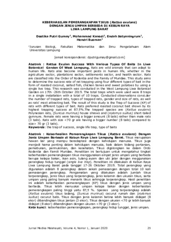 Tikus merupakan hewan liar yang mampu beradaptasi dengan kehidupan manusia. Tikus juga menjadi hama penting dalam kehidupan manusia, baik dalam bidang pertanian, perkebunan, permukiman, dan kesehatan. Tikus digolongkan ke dalam Ordo Rodentia dan Famili Muridae. Penelitian ini bertujuan untuk mengetahui tingkat keberhasilan pemerangkapan tikus menggunakan empat jenis umpan yang berbeda berupa kelapa bakar, ikan asin, tulang ayam dan ubi jalar dengan meggunakan perangkap hidup tunggal (single live trap). Penelitian ini dilakukan di Kebun Raya Liwa Lampung Barat pada tanggal 17-26 Oktober 2019. Total perangkap yang digunakan adalah 8 perangkap dalam sekali pemasangan dengan total 10 kali pemasangan perangkap. Pengamatan yang dilakukan adalah jumlah tikus terperangkap, jenis tikus yang terperangkap, jenis kelamin dan ukuran tikus, serta umpan yang paling banyak menarik tikus sehingga terperangkap. Hasil penelitian ini adalah keberhasilan pemerangkapan (KP) tikus dengan jenis umpan yang berbeda. Tikus lebih menyukai umpan kelapa bakar dengan keberhasilan pemerangkapan paling tinggi yaitu 87,5 %. Spesies yang terperangkap adalah (Rattus exulans) tikus ladang, (Suncus murinus) cecurut rumah dan (Hylomys suillus) cecurut babi. Tikus dengan jenis kelamin betina lebih banyak didapat (8 ekor) dibandingkan tikus jantan (3 ekor). Tikus dengan ukuran <70 gr lebih banyak didapat (8 ekor) dibandingkan dengan ukuran >70 gr (3 ekor).