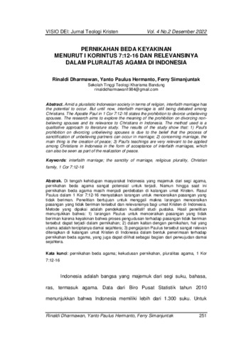 Di tengah kehidupan masyarakat Indonesia yang majemuk dari segi agama, pernikahan beda agama sangat potensial untuk terjadi. Namun hingga saat ini pernikahan beda agama masih menjadi perdebatan di kalangan umat Kristen. Rasul Paulus dalam 1 Kor 7:12-16 menyatakan larangan untuk menceraikan pasangan yang tidak beriman. Penelitian bertujuan untuk menggali makna larangan menceraikan pasangan yang tidak beriman tersebut dan relevansinya bagi umat Kristen di Indonesia. Metode yang dipakai adalah pendekatan kualitatif studi pustaka. Hasil penelitian menunjukkan bahwa: 1) larangan Paulus untuk menceraikan pasangan yang tidak beriman karena keyakinan bahwa proses pengudusan terhadap pasangan tidak beriman tersebut dapat terjadi dalam pernikahan; 2) dalam kaitan dengan pernikahan, hal yang utama adalah terciptanya damai sejahtera; 3) pengajaran Paulus tersebut sangat relevan diterapkan di kalangan umat Kristen di Indonesia dalam bentuk penerimaan terhadap pernikahan beda agama, yang juga dapat dilihat sebagai bagian dari perwujudan damai sejahtera.