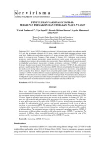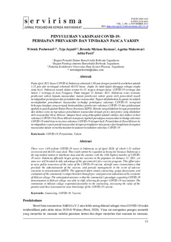 Wiwiek, Probowati and Tejo, Jayadi and Brenda, Miriane Rustam and Agatha, Maheswari Adita Putri (2022) Penyuluhan vaksinasi Covid-19 persiapan prevaksin dan tindakan pasca vaksin. Servirisma: Jurnal Pengabdian Kepada Masyarakat, 2 (2): 1. pp. 77-84. ISSN 2809-1442