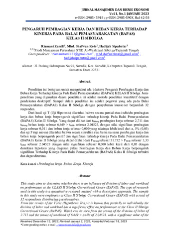 Riamani, Zamili and Mhd., Shafwan Koto and Hadijah, Sipahutar (2023) Pengaruh pembagian kerja dan beban kerja terhadap kinerja pada Balai Pemasyarakatan (BAPAS) kelas II Sibolga. Jurnal Manajemen dan Bisnis Ekonomi, 1 (1). pp. 42-58. ISSN 2985-590X