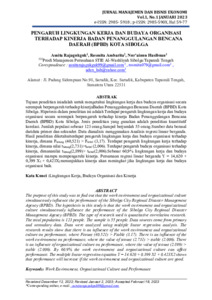 Asnita, Rajagukguk and Rosmita, Ambarita and Nur’ainun, Hasibuan (2023) Pengaruh lingkungan kerja dan budaya organisasi terhadap kinerja Badan Penanggulangan Bencana Daerah (BPBD) kota Sibolga. Jurnal Manajemen dan Bisnis Ekonomi, 1 (1). pp. 59-77. ISSN 2985-590X