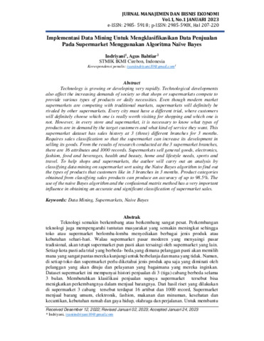 Indriyani, Indriyani and Agus, Bahtiar (2023) Implementasi data mining untuk mengklasifikasikan data penjualan pada supermarket menggunakan Algoritma Naïve Bayes. Jurnal Manajemen dan Bisnis Ekonomi, 1 (1). pp. 207-220. ISSN 2985-590X