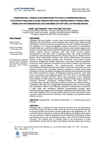 Harsiti, Harsiti and Agus, Setyawan and Haris, Triono Sigit and Afif, Johan (2022) Upgrading skill pekerja guna mendukung tata kelola administrasi melalui pelatihan optimalisasi aplikasi perkantoran pada Federasi Serikat Pekerja Kimia, Energi Dan Pertambangan Seluruh Indonesia (FSP KEP SPSI) se-Provinsi Banten. Jurnal Dharmabakti Nagri, 1 (1): 1. pp. 1-10. ISSN 2964-1055