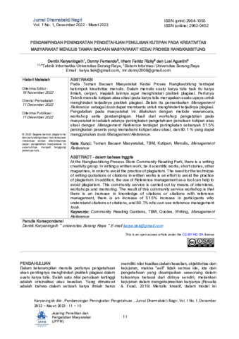 Pada Taman Bacaan Masyarakat Kedai Proses Rangkasbitung terdapat kelompok kreativitas menulis. Dalam menulis suatu karya tulis baik itu karya ilmiah, cerpen, majalah lainnya agar menghindari praktek plagiasi. Perlunya Teknik menulis kutipan atau sitasi pada karya tulis merupakan suatu upaya untuk menghindari terjadinya praktek plagiasi. Selain itu pemanfaatan Management Reference sebagai tools dapat membantu untuk menghindari terjadinya plagiasi. Pengabdian pada masyarakat ini dilakukan dengan metode wawancara, workshop serta pendampingan. Hasil dari workshop pengabdian pada masyarakat ini adalah adanya peningkatan pengetahuan penulisan kutipan atau sitasi dengan Management Reference terdapat peningkatan sebanyak 51.5% peningkatan peserta yang memahami kutipan atau sitasi, dan 80.1 % yang dapat menggunakan tools Management Reference.