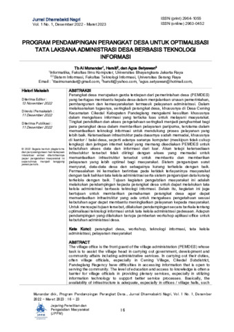 Tb Ai, Munandar and Harsiti, Harsiti and Agus, Setyawan (2022) Program pendampingan perangkat desa untuk optimalisasi tata laksana administrasi desa berbasis teknologi informasi. Jurnal Dharmabakti Nagri, 1 (1): 3. pp. 16-23. ISSN 2964-1055