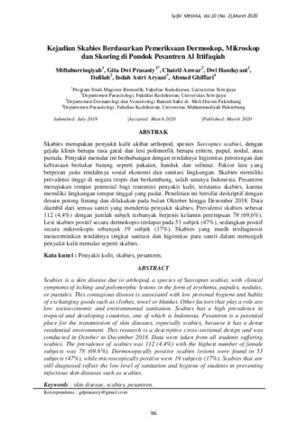 Miftahurrizqiyah, Miftahurrizqiyah and Gita, Dwi Prasasty and Chairil, Anwar and Dwi, Handayani and Dalilah, Dalilah and Indah, Astri Aryani and Ahmad, Ghiffari (2020) Kejadian skabies berdasarkan pemeriksaan dermoskop, mikroskop dan skoring di Pondok Pesantren Al Ittifaqiah. Syifa Medika: Jurnal Kedokteran dan Kesehatan, 10 (2): 3. pp. 96-106. ISSN 2087-233X