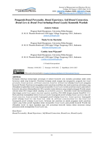Juniarty, Siahaan and Thalia Nevita, Marchelin and Cynthia Anna, Wijayanti (2023) Pengaruh brand personality, brand experience, self-brand connection, brand love & brand trust terhadap brand loyalty kosmetik Wardah. Journal of Management and Business Review, 20 (1): 3. pp. 34-54. ISSN 1829-8176