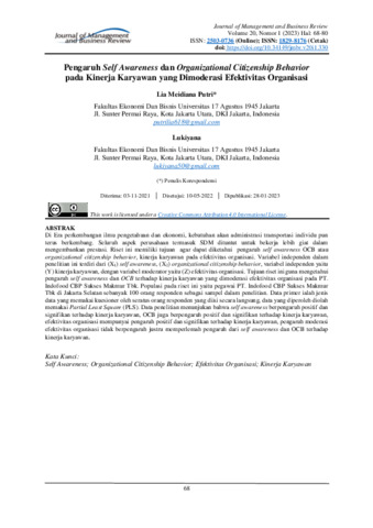 Lia Meidiana, Putri and Lukiyana, Lukiyana (2023) Pengaruh self awareness dan organizational citizenship behavior pada kinerja karyawan yang dimoderasi efektivitas organisasi. Journal of Management and Business Review, 20 (1): 5. pp. 68-80. ISSN 1829-8176