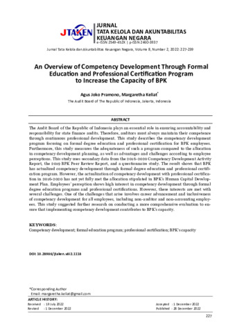 Agus, Joko Pramono and Margaretha, Keliat (2022) An overview of competency development through formal education and professional certification program to increase the capacity of BPK. Jurnal Tata Kelola dan Akuntabilitas Keuangan Negara, 8 (2): 7. pp. 227-239. ISSN 2460-3937