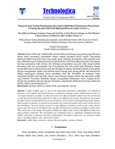Nadya Fairuz, Soraya and Bambang, Kusmanadhi and Susan Barbara, Patricia and Dyah Ayu, Savitri (2023) Pengaruh jenis wadah penyimpanan dan ukuran biji dalam penyimpanan pasca panen terhadap karakteristik fisik biji kopi robusta (Coffea robusta L.). Technologica, 1 (2): 2. pp. 14-20. ISSN 2827-9492
