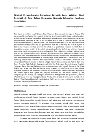 Esra, Henciska Lumbanbatu (2023) Strategi pengembangan pariwisata berbasis local wisdom studi deskriptif di Desa Bakara Kecamatan Baktiraja Kabupaten Humbang Hasundutan. Bagas: Jurnal Antropologi Sumatera, 2 (1): 2. pp. 177-188. ISSN 2810-0506