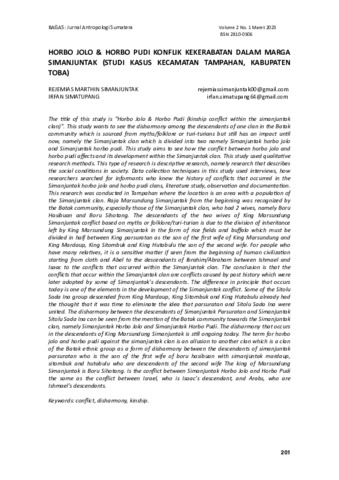 Rejemias, Marthin Simanjutak and Irfan, Simatupang (2023) Horbo jolo & horbo pudi konflik kekerabatan dalam marga Simanjuntak (Studi kasus Kecamatan Tampahan, Kabupaten Toba). Bagas: Jurnal Antropologi Sumatera, 2 (1): 4. pp. 201-212. ISSN 2810-0506