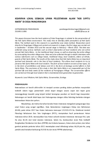 Hotmaringan, Pandiangan and Zulkifli, Lubis (2023) Kearifan lokal sebagai upaya pelestarian alam “Aek Sipitu Mata” di Desa Pangiringan. Bagas: Jurnal Antropologi Sumatera, 2 (1): 6. pp. 229-247. ISSN 2810-0506