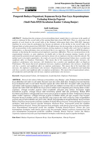 Andi, Andriyana (2023) Pengaruh budaya organisasi, kepuasan kerja dan gaya kepemimpinan terhadap kinerja pegawai (studi pada BPJS kesehatan kantor cabang Banjar). Jurnal Manajemen dan Ekonomi Syariah, 1 (3). pp. 25-40. ISSN 2988-2249