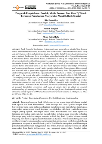 Riki, Pransiska and Ambok, Pangiuk and Ahsan, Putra Hafiz (2023) Pengaruh pengetahuan produk, media promosi dan Word Of Mouth terhadap pemahaman masyarakat memilih Bank Syariah. Jurnal Manajemen dan Ekonomi Syariah, 1 (3). pp. 54-73. ISSN 2988-2249