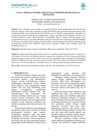 Amrin, Rani and Syafira, Baiti Mahmud (2022) Upaya menekan keterlambatan dalam proses bongkar muat kontainer. Pakkappala: Jurnal Ilmiah Kemaritiman, 1 (1): 1. pp. 1-7. ISSN 2962-0627