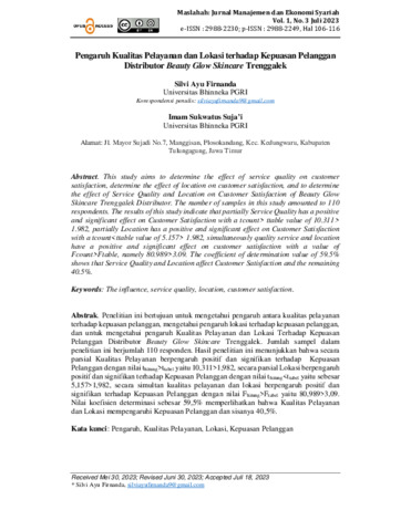 Silvi, Ayu Firnanda and Imam, Sukwatus Suja’i (2023) Pengaruh kualitas pelayanan dan lokasi terhadap kepuasan pelanggan distributor Beauty Glow Skincare Trenggalek. Jurnal Manajemen dan Ekonomi Syariah, 1 (3). pp. 106-116. ISSN 2988-2249