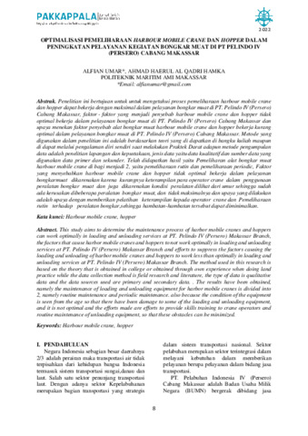 Alfian, Umar and Ahmad, Haerul Al Qadri Hamka (2022) Optimalisasi pemeliharaan harbour mobile crane dan hopper dalam peningkatan pelayanan kegiatan bongkar muat di PT. Pelindo IV (Persero) Cabang Makassar. Pakkappala: Jurnal Ilmiah Kemaritiman, 1 (1): 2. pp. 8-13. ISSN 2962-0627