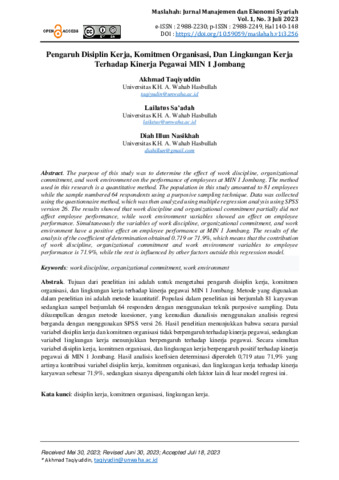 Akhmad, Taqiyuddin and Lailatus, Sa’adah and Diah, Illun Nasikhah (2023) Pengaruh disiplin kerja, komitmen organisasi, dan lingkungan kerja terhadap kinerja pegawai MIN 1 Jombang. Jurnal Manajemen dan Ekonomi Syariah, 1 (3). pp. 140-148. ISSN 2988-2249