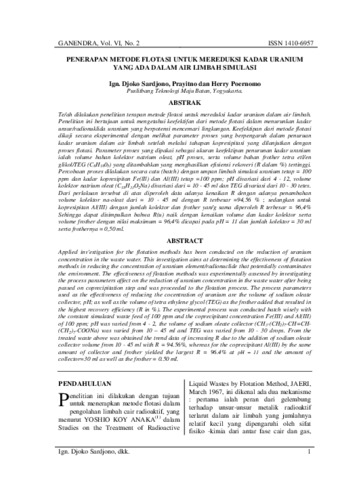 Telah dilakukan penelitian terapan metode flotasi untuk mereduksi kadar uranium dalam air limbah. Penelitian ini bertujuan untuk mengetahui keefektifan dari metode flotasi dalam menurunkan kadar unsur/radionuklida uranium yang berpotensi mencemari lingkungan. Keefektipan dari metode flotasi dikaji secara eksperimental dengan melihat parameter proses yang berpengaruh dalam penuruan kadar uranium dalam air limbah setelah melalui tahapan kopresipitasi yang dilanjutkan dengan proses flotasi. Parameter proses yang dipakai sebagai ukuran keefektipan penurunan kadar uranium ialah volume bahan kolektor natrium oleat, pH proses, serta volume bahan frother tetra etl/en glikol/TEG (C8H1805) yang ditambahkan yang menghasilkan efisiensi rekoveri (R dalam %) tertinggi. Percobaan proses dilakukan secara catu (batch) dengan umpan limbah simulasi uranium tetap = 100 ppm dan kadar kopresipitan Fe(lIl) dan Al(III) tetap =100 ppm; pH divariasi dari 4 - 12, volume kolektor natrium oleat (C18H33O2Na) divariasi dari = 10 - 45 ml dan TEG divariasi dari 10 - 30 tetes. Dari perlakuan tersebut di atas diperoleh data adanya kenaikan R dengan adanya penambahan volume kolektor na-oleat dari = 10 - 45 ml dengan R terbesar =94,56 % ; sedangkan untuk kopresipitan Al(III) dengan jumlah kolektor dan frother yan/g sama diperoleh R terbesar = 96,4% Sehingga dapat disimpulkan bahwa R(u) naik dengan kenaikan volume dan kadar kolektor serta volume frother dengan nilai maksimum = 96,4% dicapai pada pH = 11 dan jumlah kolektor = 30 ml serta frothernya = 0,50 ml.