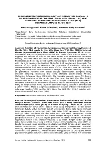 Marisa, Anggraini and Firhat, Esfandiari and Muhamad Rizky, Arahman (2020) Hubungan kepatuhan minum obat antiretroviral pasca 6-12 bulan dengan kadar cd4 pada lelaki seks lelaki (LSL) yang terinfeksi Human Immunodeficiency Virus (HIV) di Bandar Lampung tahun 2019. Jurnal Medika Malahayati, 4 (4): 5. 283 -290. ISSN 2355-6757