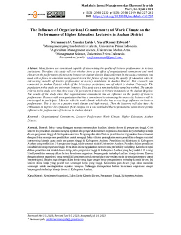 | Uncontrolled Keywords: | Organizational Commitment, Lecturer Performance Work Climate, Higher Education, Asahan District |