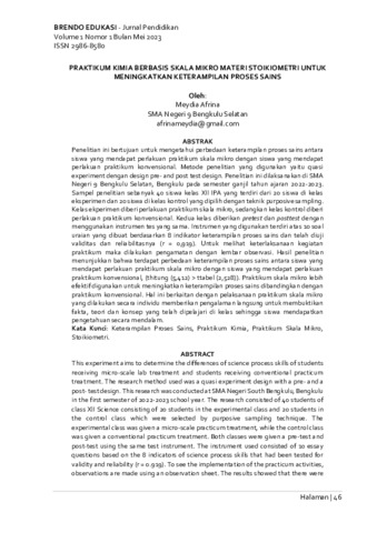 Meydia, Afrina (2023) Praktikum kimia berbasis skala mikro materi stoikiometri untuk meningkatkan keterampilan proses sains. Brendo Edukasi, 1 (1): 4. pp. 46-59. ISSN 2986-8580