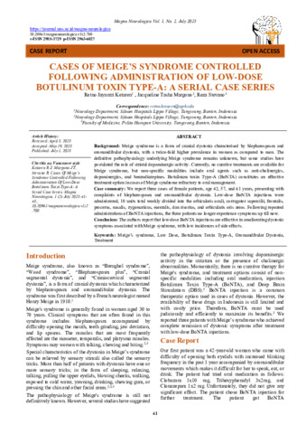 Retno, Jayantri Ketaren and Jacqueline, Tasha Margono and Reza, Stevano (2023) Cases of Meige’s syndrome controlled following administration of low-dose botulinum toxin type-a: A serial case series. Magna Neurologica, 1 (2): 5. pp. 41-43. ISSN 2963-6027