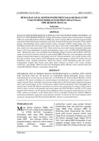 INSTALASI SISTEM INSTRUMENTASI & KENDALI UNIT VAKUM MESIN BERKAS ELEKTRON 350 KeV/10 mA TIPE REMOTE MANUAL. Sedang diselesaikan instalasi Sistem Instrumentasi & Kendali (SIK) unit vakum Mesin Berkas Elektron (MBE) tipe remote manual. SIK ini terdiri dari bagian kendali manual jarak jauh dan bagian monitoring jarak jauh. Prinsip kendali manual jarak jauh (50 m) adalah dengan mengendalikan status on/off terminal sumber tegangan 220Volt untuk pompa dan valve. Pemilihan terminal 220 Volt untuk pompa dan valve diatur dari ruang kendali MBE (saklar penyedia daya untuk valve dan pompa diatur ON). Untuk monitoring jarak jauh tingkat kevakuman digunakan kamera CCT yang ditempatkan di depan pirani/penning gauge serta unit TPG.300 BALZER pompa turbo. Monitoring status valve terbuka/tertutup dilakukan dengan menarik kabel indikator LED dari setiap valve ke panel transrak 19 inchi di ruang kendali MBE. Pneumatic valve dilengkapi sistem pipa kompresi dengan unit kompresor dan tabung reservoir. Seluruh pneumatic valve (selain venting valve) dari tipe normaly closed. Sistem CCTV dilengkapi enam buah kamera, sebuah TV monitor dan unit multiplexer untuk memilih gambarnya. Salah satu kamera CCTV ditempatkan pada unit rotator, menggunakan kendali infra merah yang dapat diatur berputar ke kanan / kiri sesuai orientasi monitoring yang dipilih . Hasil uji coba awal menunjukan bahwa SIK tipe remote manual untuk unit vakum Mesin Berkas Elektron menunjukan kinerja baik.
