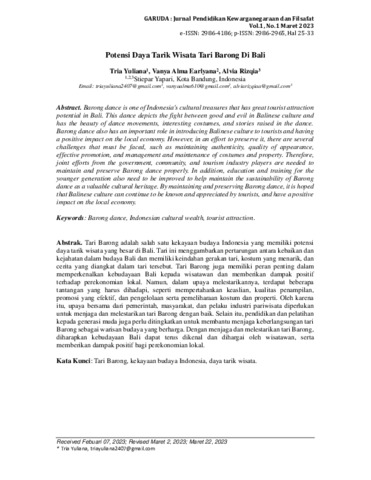 Tria, Yuliana and Vanya, Alma Earlyana and Alvia, Rizqia (2023) Potensi daya tarik wisata Tari Barong Di Bali. Jurnal Pendidikan Kewarganegaraan dan Filsafat, 1 (1). pp. 25-33. ISSN 2986-2965