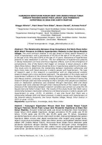 Ringgo, Alfarisi and Putri Amsa Tiara, Diksa and Aswan, Jhonet and Achmad, Farich (2023) Hubungan kepatuhan minum obat dan indeks massa tubuh dengan tekanan darah pada lanjut usia penderita hipertensi di desa Dwi Karya Mustika. Jurnal Medika Malahayati, 7 (2): 3. 597 -606. ISSN 2355-6757