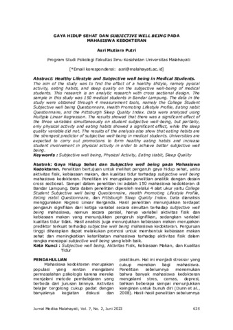 Asri Mutiara, Putri (2023) Gaya hidup sehat dan subjective well being pada mahasiswa kedokteran. Jurnal Medika Malahayati, 7 (2): 7. 635 -642. ISSN 2355-6757