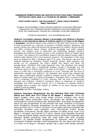 Cindi Cantika, Viyani and Yesi, Nurmalasari and Festy Ladyani, Mustofa and Dessy, Hermawan (2023) Hubungan pengetahuan ibu dan aktivitas fisik anak terhadap status gizi anak usia 6-12 tahun di SD Negeri 1 Srengsem. Jurnal Medika Malahayati, 7 (2): 9. 654 -663. ISSN 2355-6757